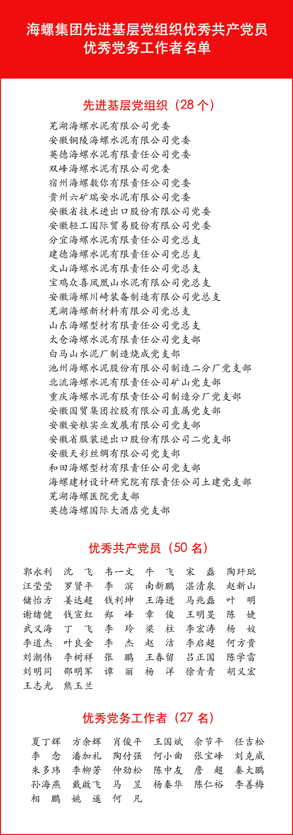 6月27日下午,集團黨委在總部隆重召開慶祝建黨98周年暨“兩優一先”表彰大會,慶祝中國共產黨98歲生日,集中表彰近兩年涌現出的先進基層黨組織、優秀共產黨員和優秀黨務工作者,深入開展先進典型教育,激勵各級黨組織和廣大黨員以先進為榜樣,不忘入黨初心,堅定發展信心,擔負職責使命,為加快實現“一帶一路”和“一強三冠”發展目標貢獻力量。 受表彰的先進基層黨組織、優秀共產黨員和優秀黨務工作者代表,集團黨政領導班子,集團直屬黨委領導班子,省內各企業黨委負責人以及機關部室負責人和黨員代表近200人現場參會。集團各子公司黨組織班子成員和黨群部門負責人以視頻方式參會。會議由集團黨委副書記、總經理任勇同志主持。 會議在莊嚴的國歌聲中拉開序幕。 集團公司黨委副書記齊生立同志宣讀了《關于表彰先進基層黨組織優秀共產黨員優秀黨務工作者的決定》,授予蕪湖海螺黨委等28個黨組織“先進基層黨組織”稱號;授予郭永利等50名同志“優秀共產黨員”稱號;授予夏丁輝等27名同志“優秀黨務工作者”稱號。 伴隨著激昂的音樂和熱烈的掌聲,集團黨委領導向受表彰的先進集體和先進個人頒發了獎牌和證書。 蕪湖海螺汪哲伍、蕪湖海螺新材料公司戴啟飛、安徽輕工公司王明旻、池州海螺郭永利四名同志分別代表先進基層黨組織、優秀黨務工作者、優秀共產黨員發言。他們表示要珍惜榮譽再出發,堅定理想信念,牢記黨的宗旨,以更加飽滿的工作熱情和高昂的工作斗志,在集團新一輪改革發展中建功立業。 集團黨委書記、董事長高登榜同志為全體黨員上了一堂形勢與政策課,并對進一步加強黨建工作提出要求。 他首先代表集團公司黨委,向受表彰的集體和個人表示熱烈的祝賀,向辛勤奮戰在公司各個崗位,尤其是生產一線和海外項目的廣大黨員致以節日的慰問。 他說,中國共產黨從嘉興南湖起航,開辟了一條中國特色航線。黨的十九大確立的習近平新時代中國特色社會主義思想,吹響了決勝全面建成小康社會、邁向社會主義現代化國家新征程的嘹亮號角,新時代中國特色社會主義航船再次揚帆起航,踏上中華民族偉大復興的征程。 他表示,在省委和省國資委黨委的領導下,集團黨委認真貫徹落實習近平新時代中國特色社會主義思想和黨的十九大精神,圍繞“黨建出凝聚力、黨建強戰斗力、黨建促發展力、黨建贏競爭力”,推動黨建與企業中心工作深度融合,在政治建設、工作體系、廉政建設和黨建成效上都取得了明顯成績,為集團公司經營發展提供了堅強保證。 他指出,當前國內外形勢發生深刻復雜變化,風險挑戰明顯增多,各級黨組織和廣大黨員要結合開展“不忘初心、牢記使命”主題教育,深入學習貫徹習近平新時代中國特色社會主義思想,深化對中央和省委各項決策部署的理解,準確把握當前集團公司面臨的各種形勢,切實增強工作的緊迫感和責任感,凝心聚力,拼搏實干,為集團公司又好又快發展作出新的更大貢獻。 他強調,要提高站位,扎實開展主題教育,以主題教育為契機,助力打造黨性修養有新提升、黨建工作有新提高、干部作風有新形象、企業發展有新突破的“四新工程”;要認真落實新時代黨的建設總要求,夯實基礎,推進基層黨組織全面進步、全面過硬;要深入學習領會中央紀委、省紀委全會和省國資委有關會議精神,認真落實黨風廉政建設黨委主體責任和紀委監督責任,持續鞏固“嚴強轉”專項行動成果,推動從嚴治黨向縱深發展;要加強群團建設,不斷提高新形勢下職工工作的針對性、有效性,切實為職工群眾做好事、辦實事、解難事,為企業改革發展凝聚強大合力;要落實責任,認真抓好巡視問題,注重舉一反三,進一步擴大整改成果,做好巡視整改“后半篇文章”;要認真總結上半年工作成效,對標查找工作中存在的不足,理清下半年工作思路和舉措,扎實有效地做好生產經營各項工作。 他號召,全體黨員要緊密團結在以習近平同志為核心的黨中央周圍,深入貫徹落實好中央、省委各項決策部署,以飽滿的政治熱情,良好的工作作風,勇于擔當的精神面貌,搶抓機遇、深化改革、加快發展,努力開創集團黨建工作新局面,奮力實現集團改革發展新突破,為把海螺建成具有全球競爭力的世界一流企業而努力奮斗。 任勇同志就貫徹此次會議精神提出要求,各單位要認真傳達,確保各項重點任務、具體要求落到實處;要大力宣傳先進基層黨組織的好經驗、好做法,宣傳優秀共產黨員的感人事跡和優秀品格,營造學先進、趕先進、爭先進的濃厚氛圍;領導干部要深入基層,切實抓好防暑降溫、安全環保、“七一”期間困難黨員的走訪慰問等工作,將集團黨委的關懷和要求落實到基層一線。 大會在嘹亮的國際歌中結束。 |